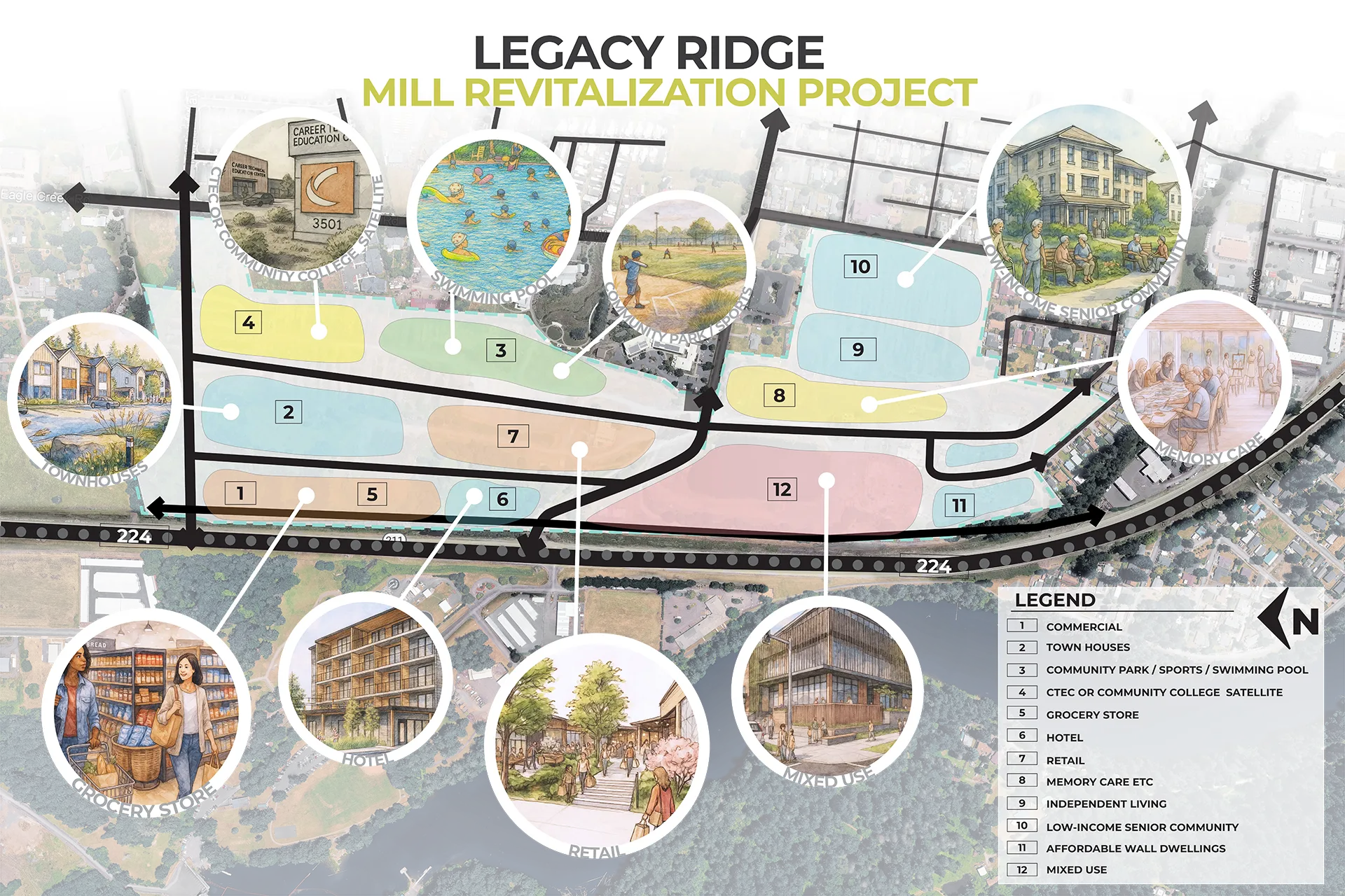 The vision for Legacy Ridge is to expand the greatness of Estacada while honoring the history of the previous generations who labored to build our town. For decades, Estacada thrived around the logging industry, which provided many jobs at the lumber mill. Legacy Ridge is located at the site of that former mill.